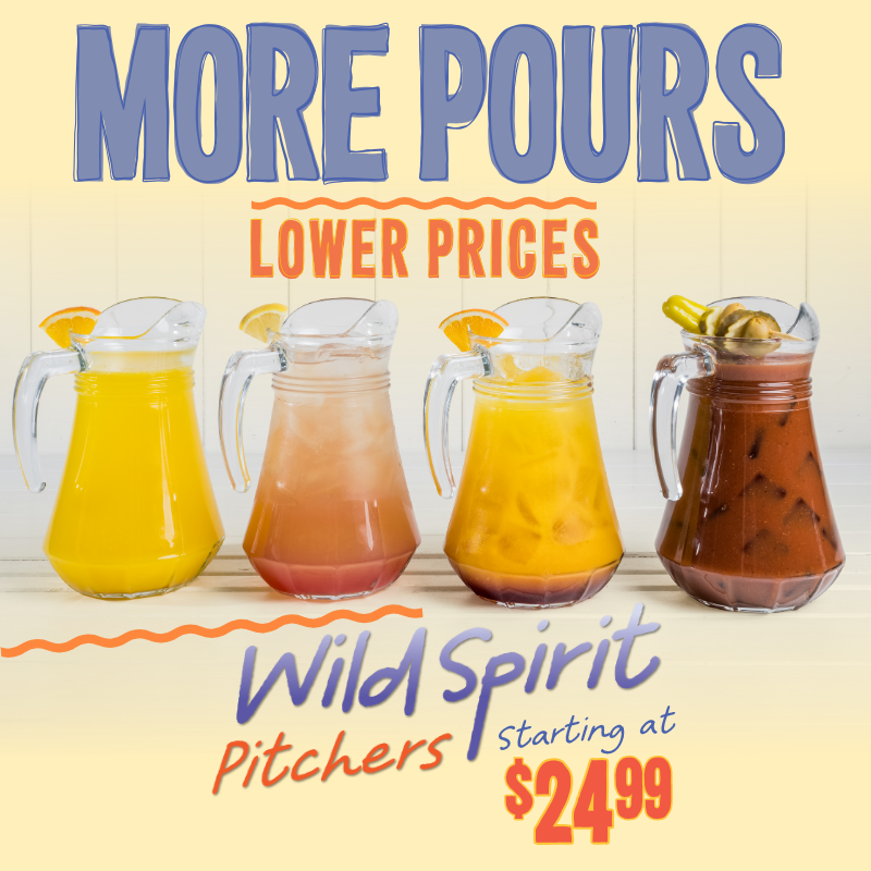 Wild Spirits Pitchers now starting at $24.99! Enjoy our Mimosas, Wild Screwdrivers, Proud Marys, Bluegrass Sunrise, Tequila Sunrise & more for less! View the new menu here.